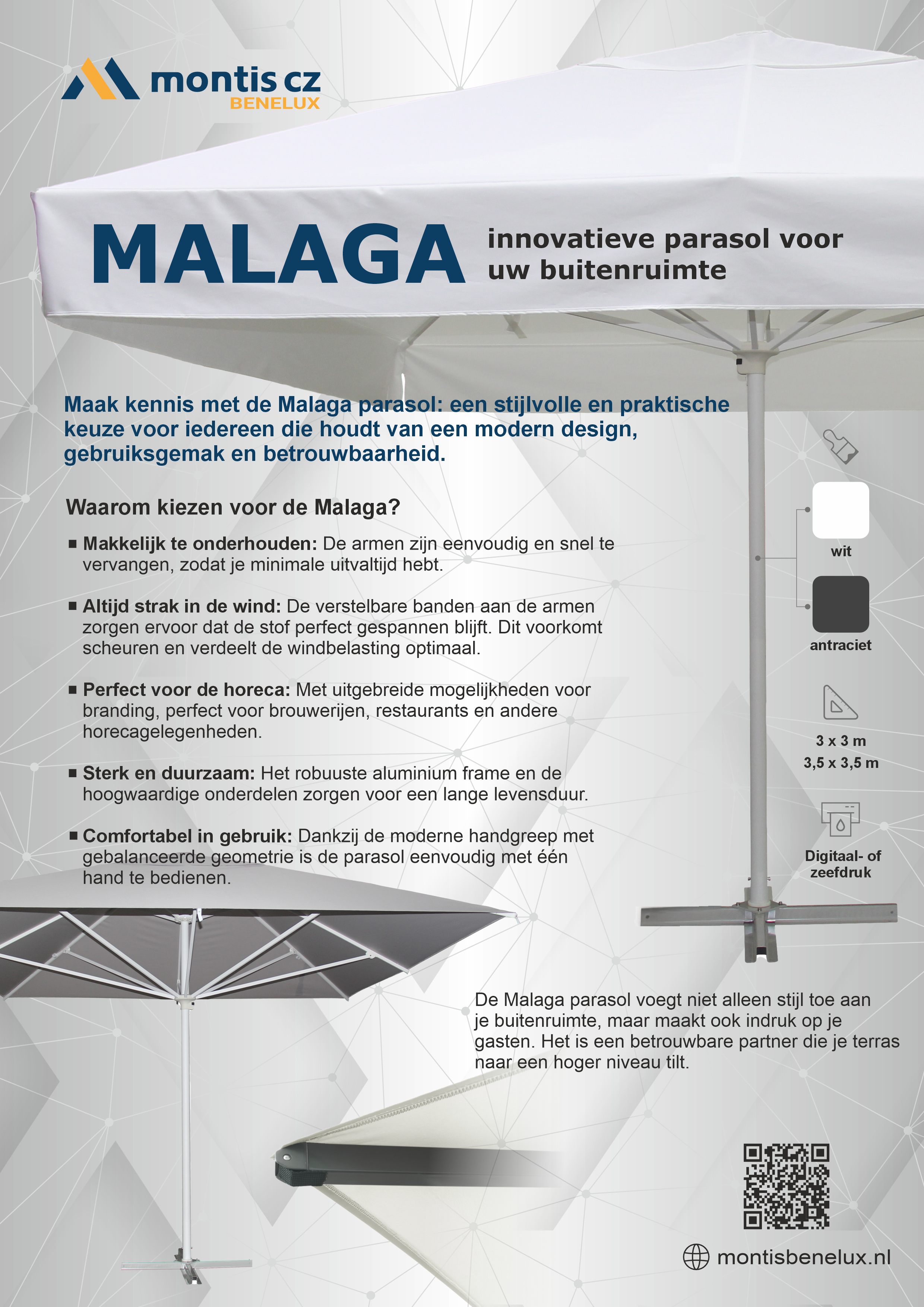Maak kennis met de MALAGA parasol, de nieuwste ster in ons assortiment en nu al een publieksfavoriet! Deze krachtpatser onder de parasols trotseert moeiteloos wind en weer, waardoor je buitenseizoen met gemak een paar weken langer duurt.